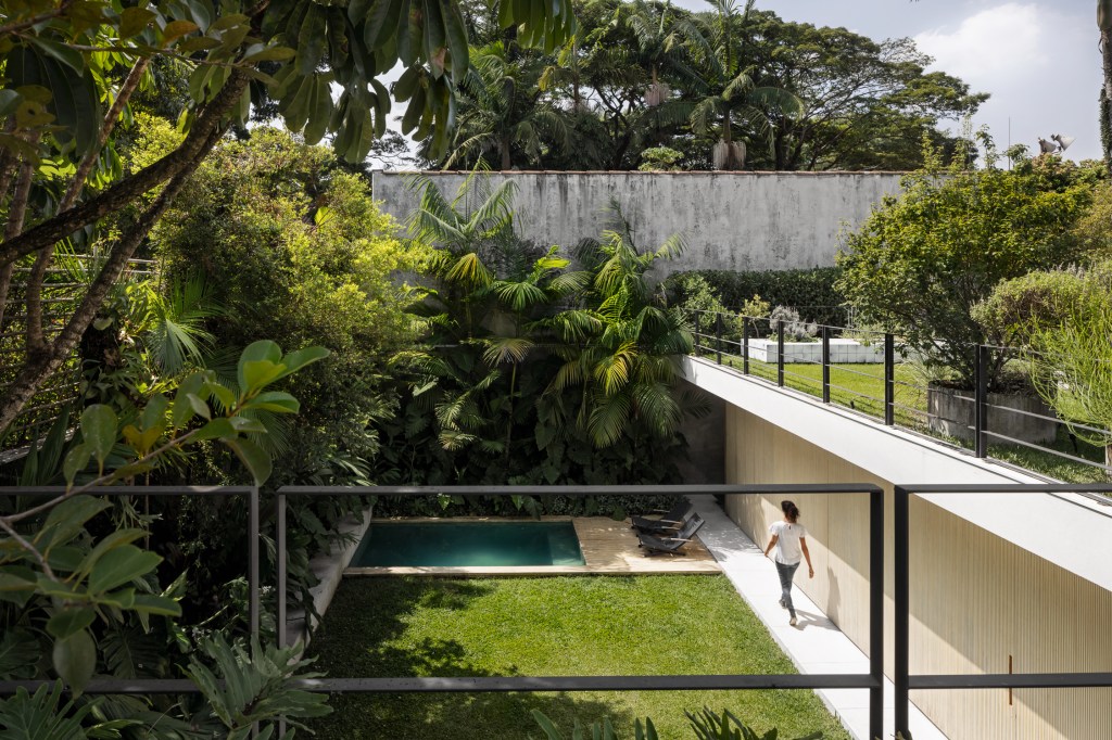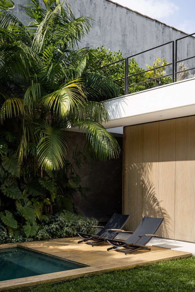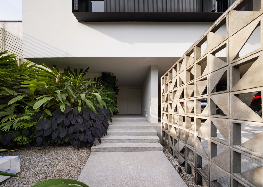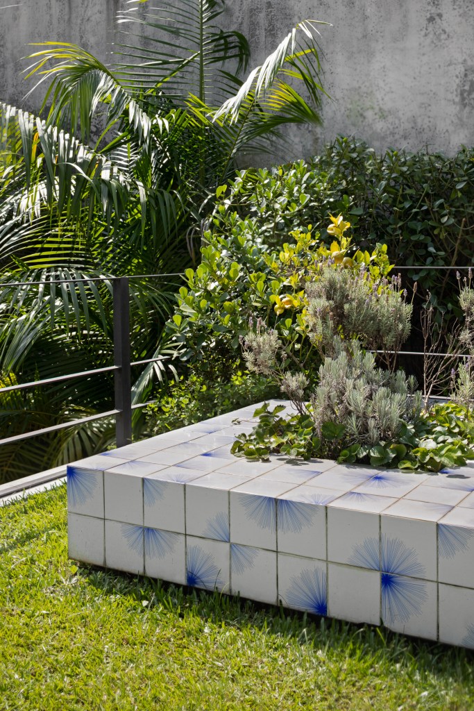 Logo na entrada, coexistindo com o jardim, pode-se observar um volume, que revestido por azulejos gráficos, propõe uma referenciação que se repete em outros pontos do projeto, imprimindo uma referência artística unificada. Na área recreativa, a piscina foi incorporada por um deck que conforma também a área de permanência.