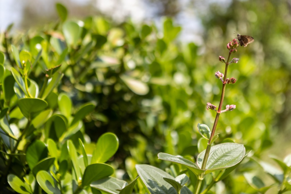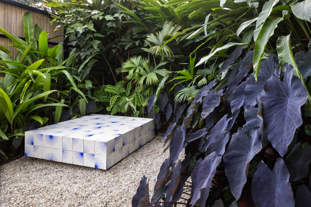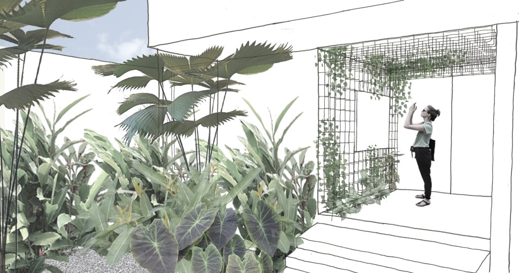 Envolvendo a edificação, o jardim se faz com composições botânicas bem tropicais, que em geral apresentam bastante biomassa, além de diversidade de texturas e colorações das flores. Os estratos vegetacionais se dão sob a copa de espécimes arbóreos que demarcam eixos visuais e condicionam a luminosidade sob suas copas, onde plantas herbáceas e arbustivas se harmonizam e se complementam paisagisticamente.