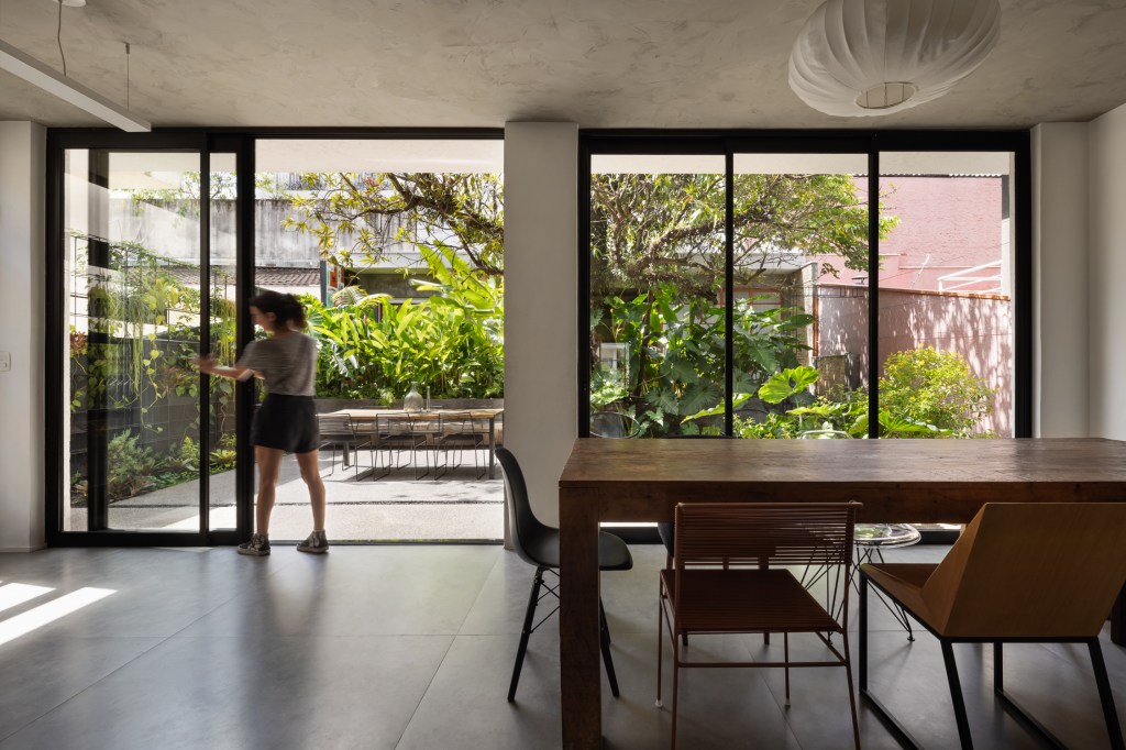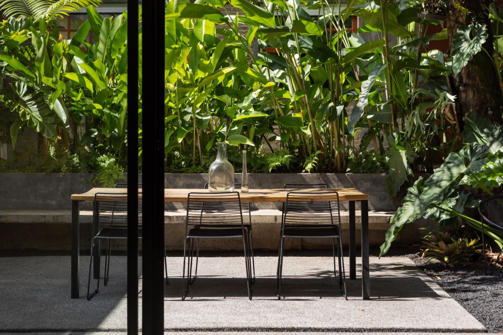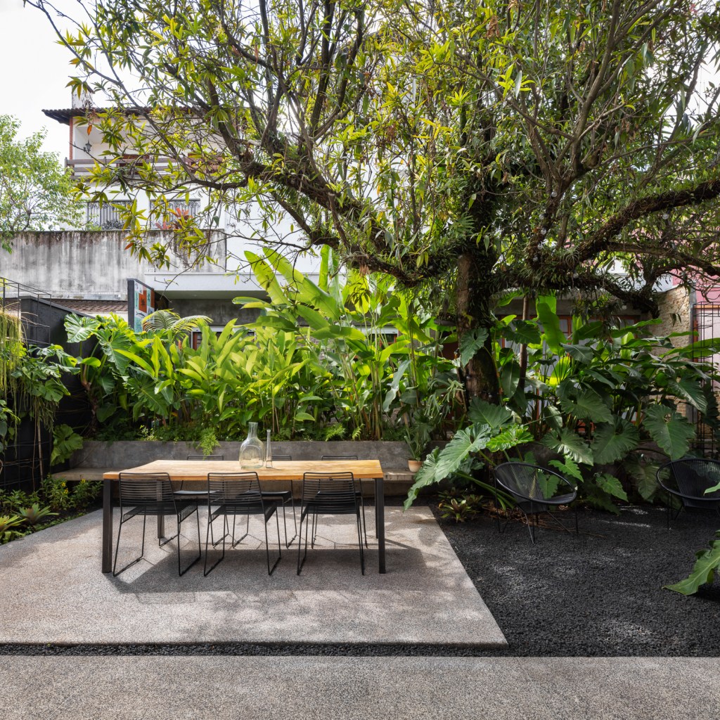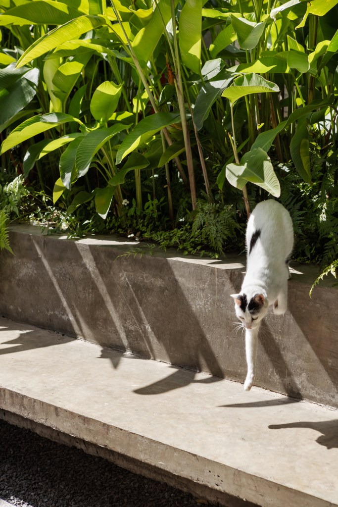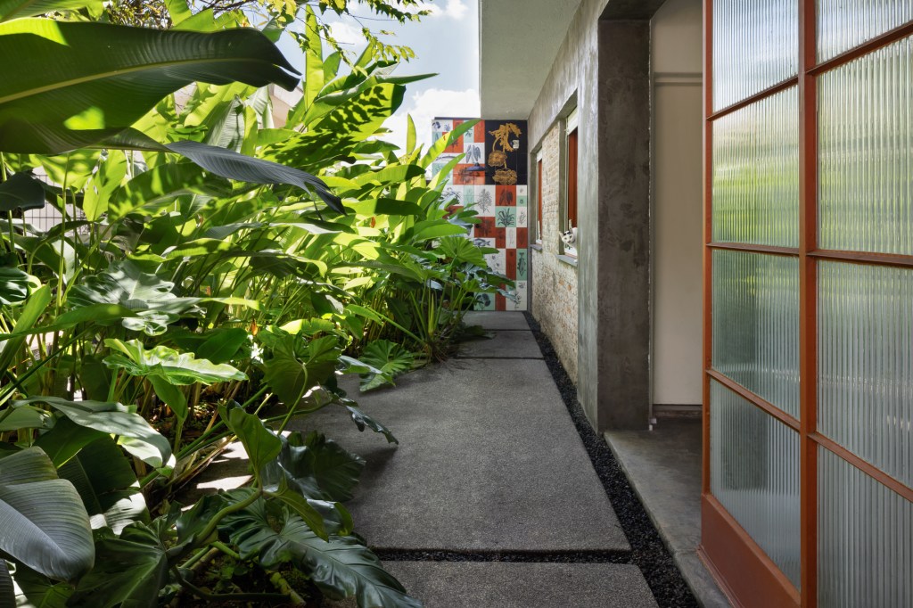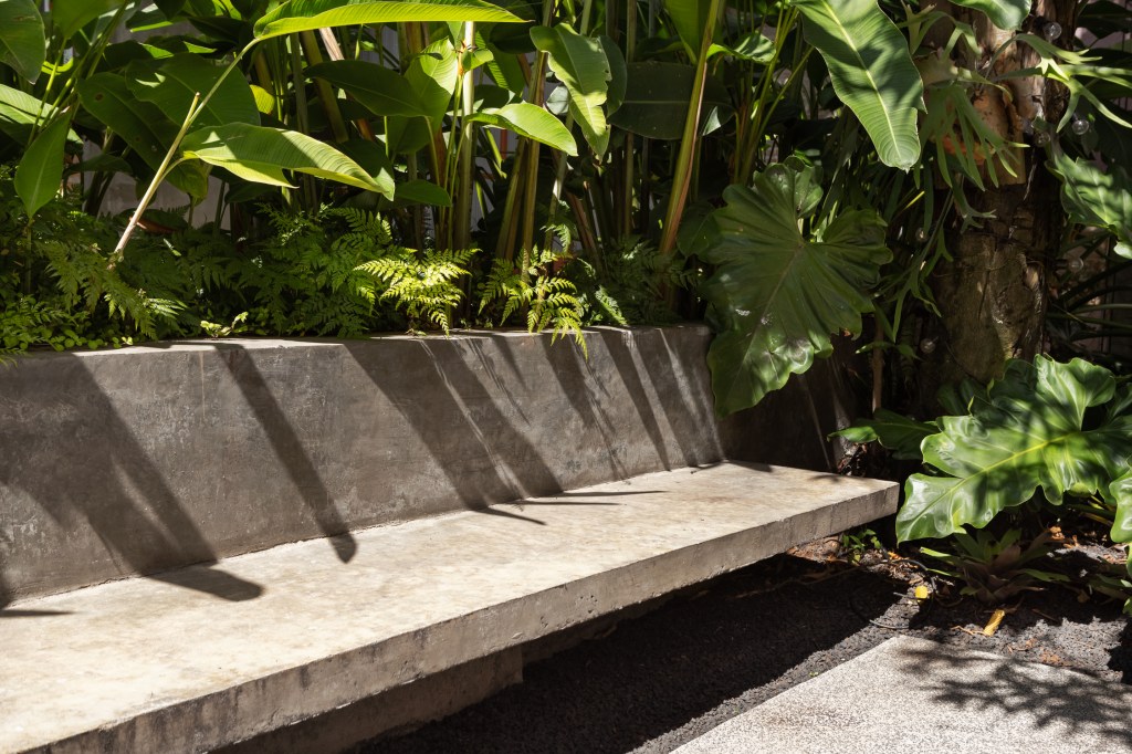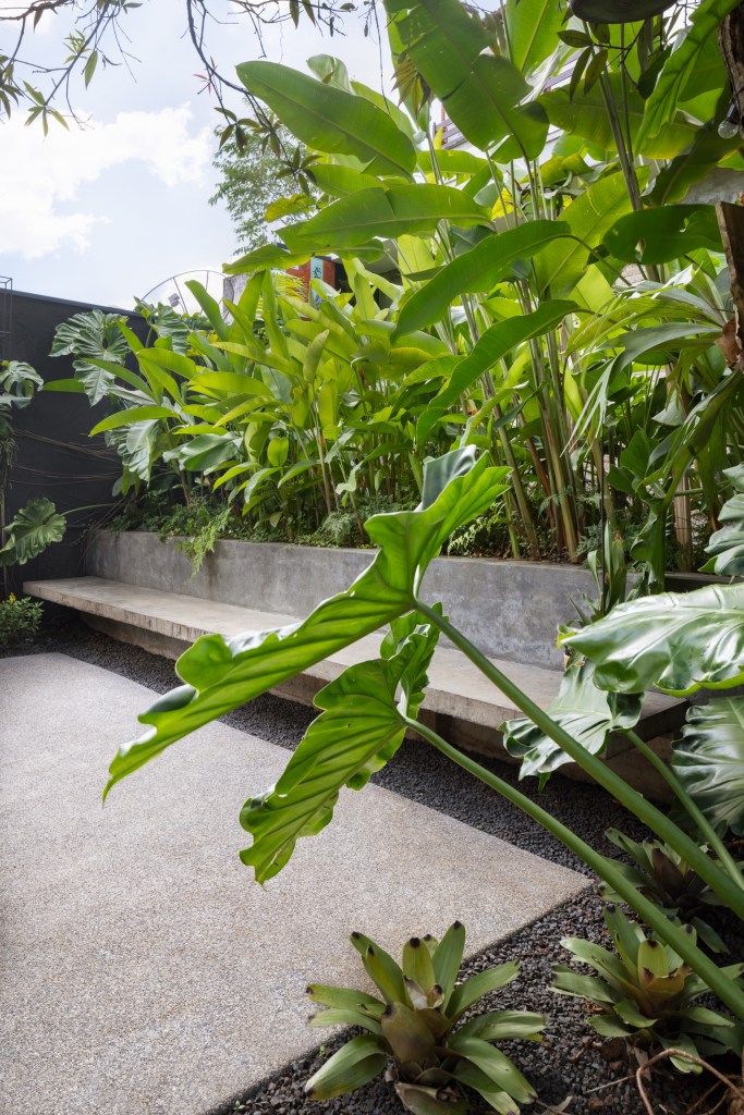 O desenho de piso, entre áreas permeáveis e impermeáveis indica o uso dos espaços. Um banco de concreto foi proposto para convidar as pessoas a utilizarem a área externa e delimita uma das áreas de canteiros com a função de dar privacidade à edícula do fundo. Nesse trecho foram utilizadas helicônias, trialis, filodendro ondulado.