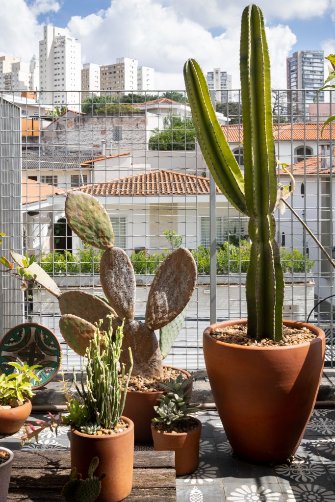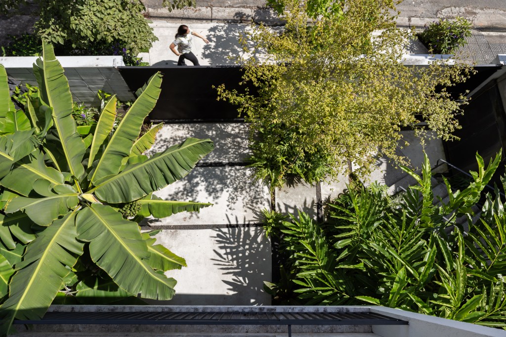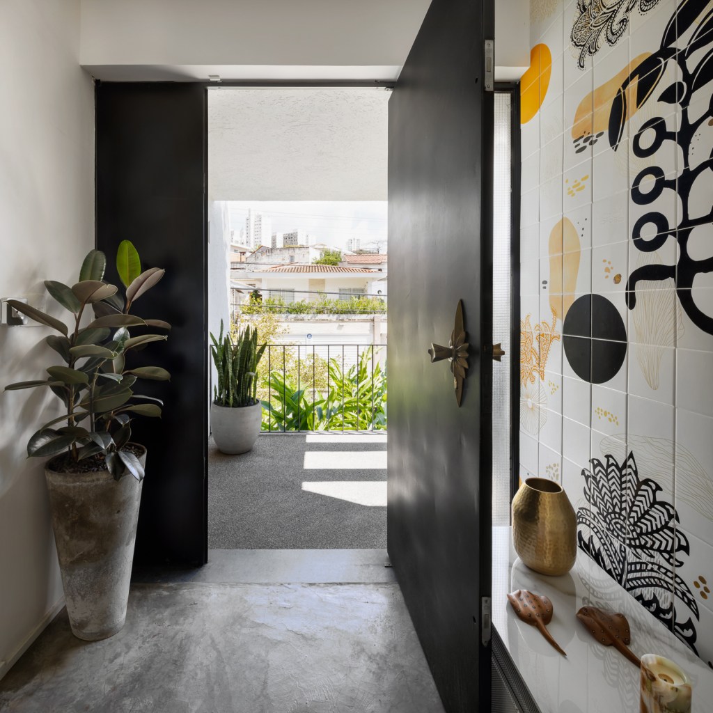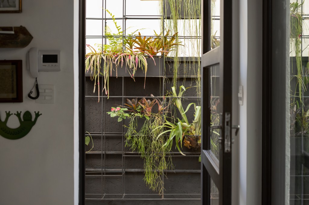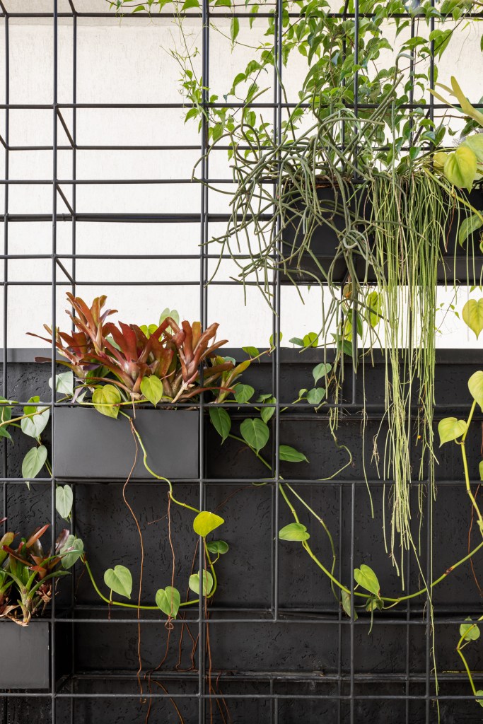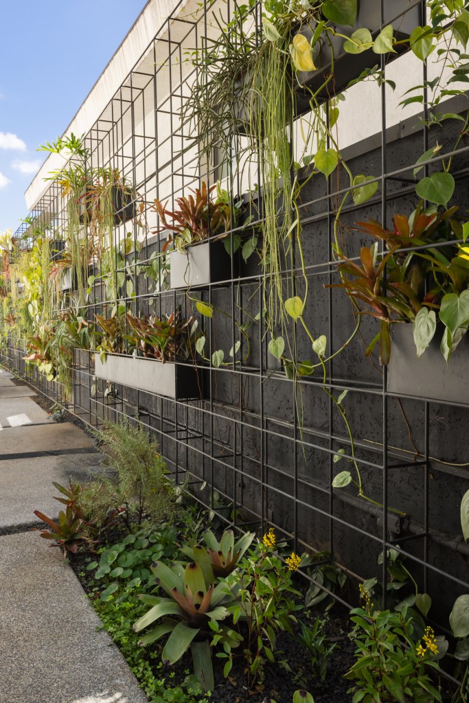 Um grande jardim vertical desenhado a partir de uma estrutura metálica ocupa o muro lateral, vegetando de uma forma lúdica o limite do terreno e também proporcionando privacidade, mas sem perder espaço. Nesse jardim vertical foram utilizadas bromélias, chifre de veado, ripsalis e guaimbés.