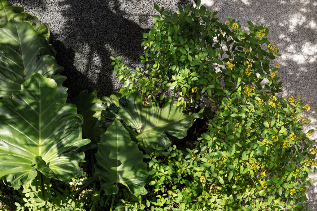 A composição do projeto da Casa Amarela foi pensada para ser um jardim cheio de cores e texturas como o trabalho artístico da proprietária da casa, Calu Fontes. Compondo com seus painéis, o projeto paisagístico dá contorno e cria espaços de permanência priorizando a vegetação nativa.