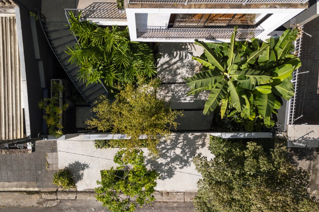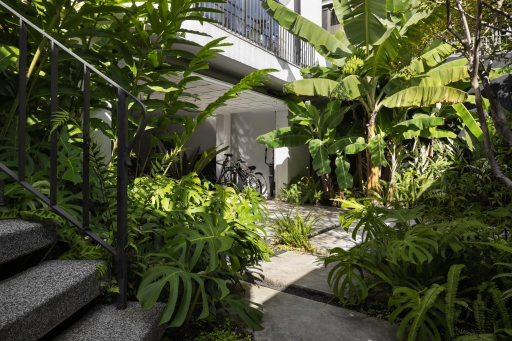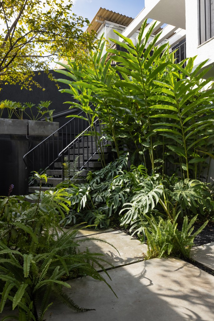 Para a entrada foi pensada a criação de um jardim denso, utilizando pitanga, banana nanica, bastão do imperador, entre outras, abraçando a escada, trazendo a sensação de passar por uma mata para chegar na casa.